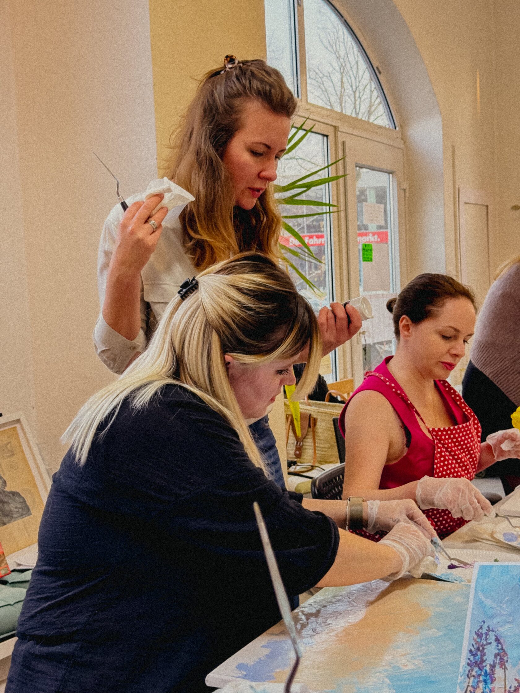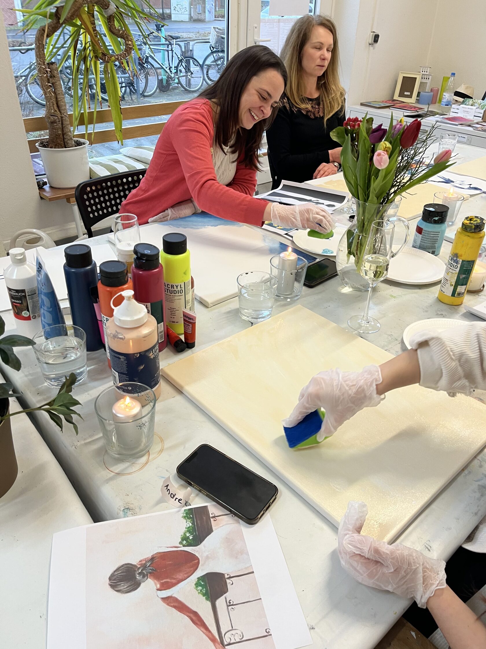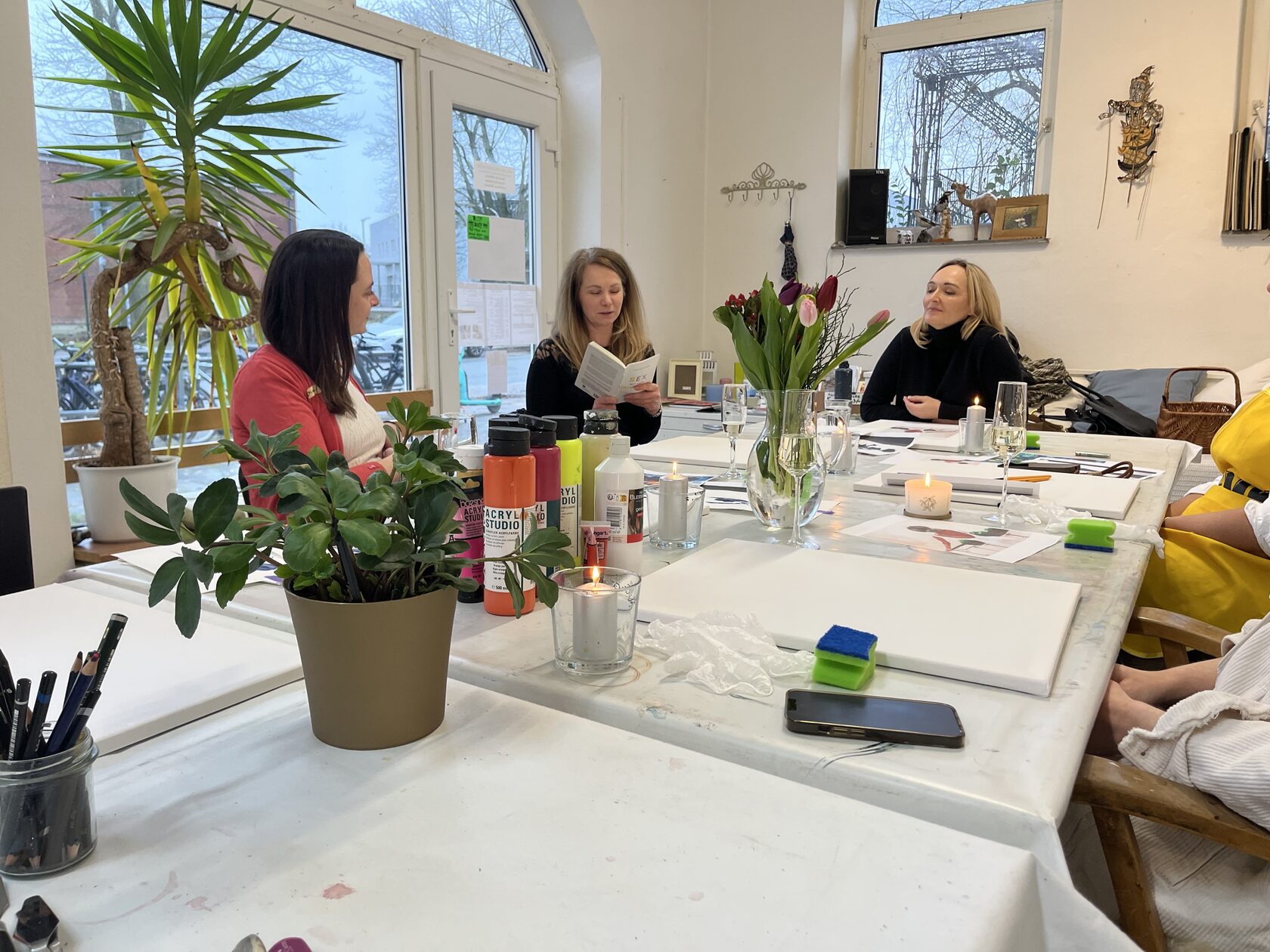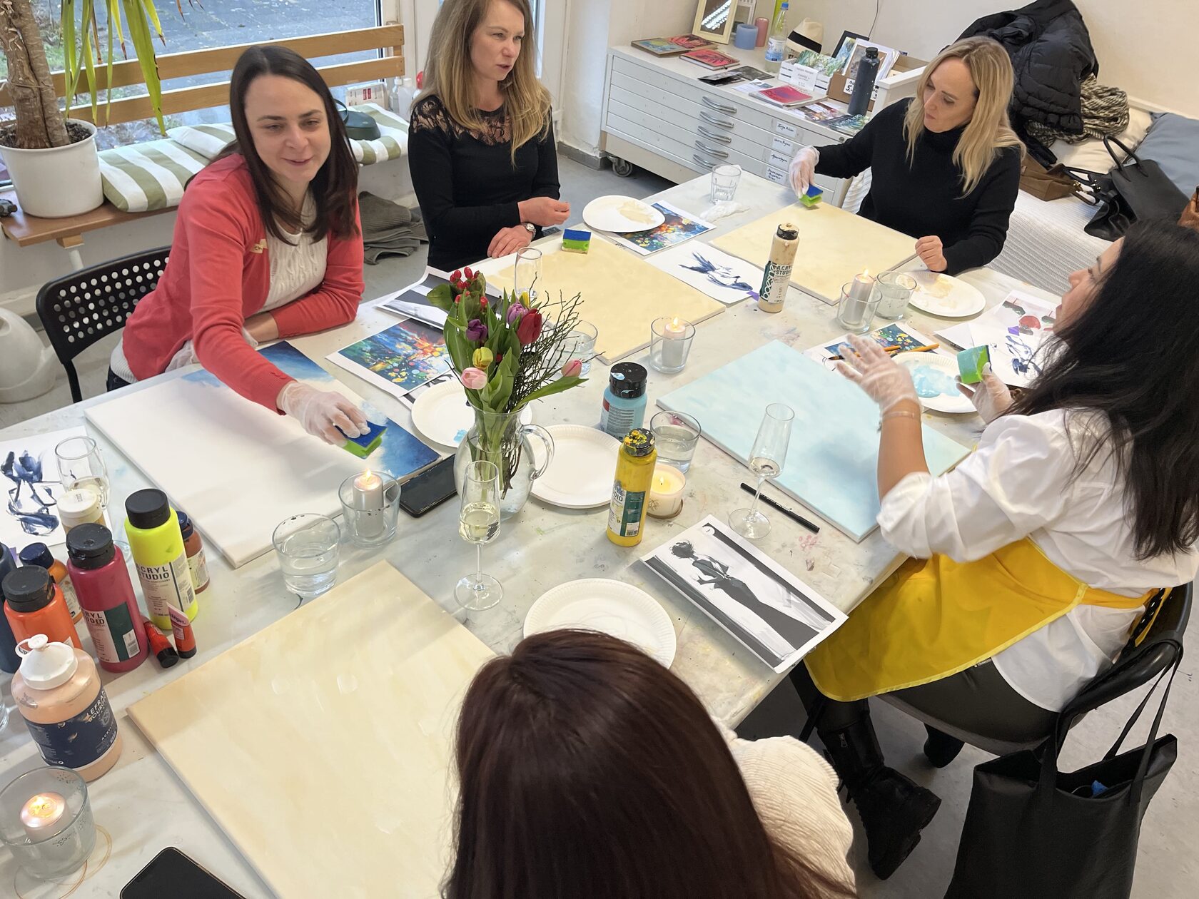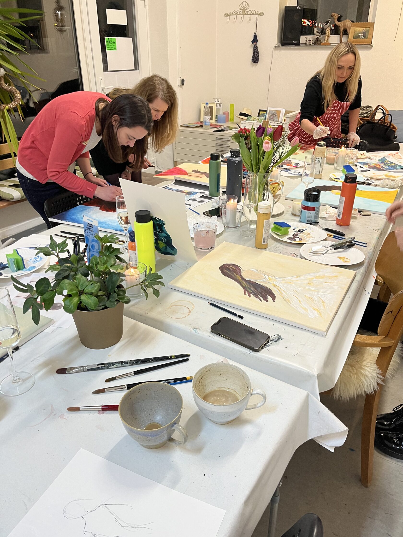 I have attended Ludmilla’s workshops several times with friends, and we always have a great time. The artworks we create are real masterpieces that we proudly hang at home. The atmosphere is creative, relaxed, and fun, and you meet nice, interesting people. Plus, there are delicious snacks and a glass of prosecco – perfect for escaping everyday life.