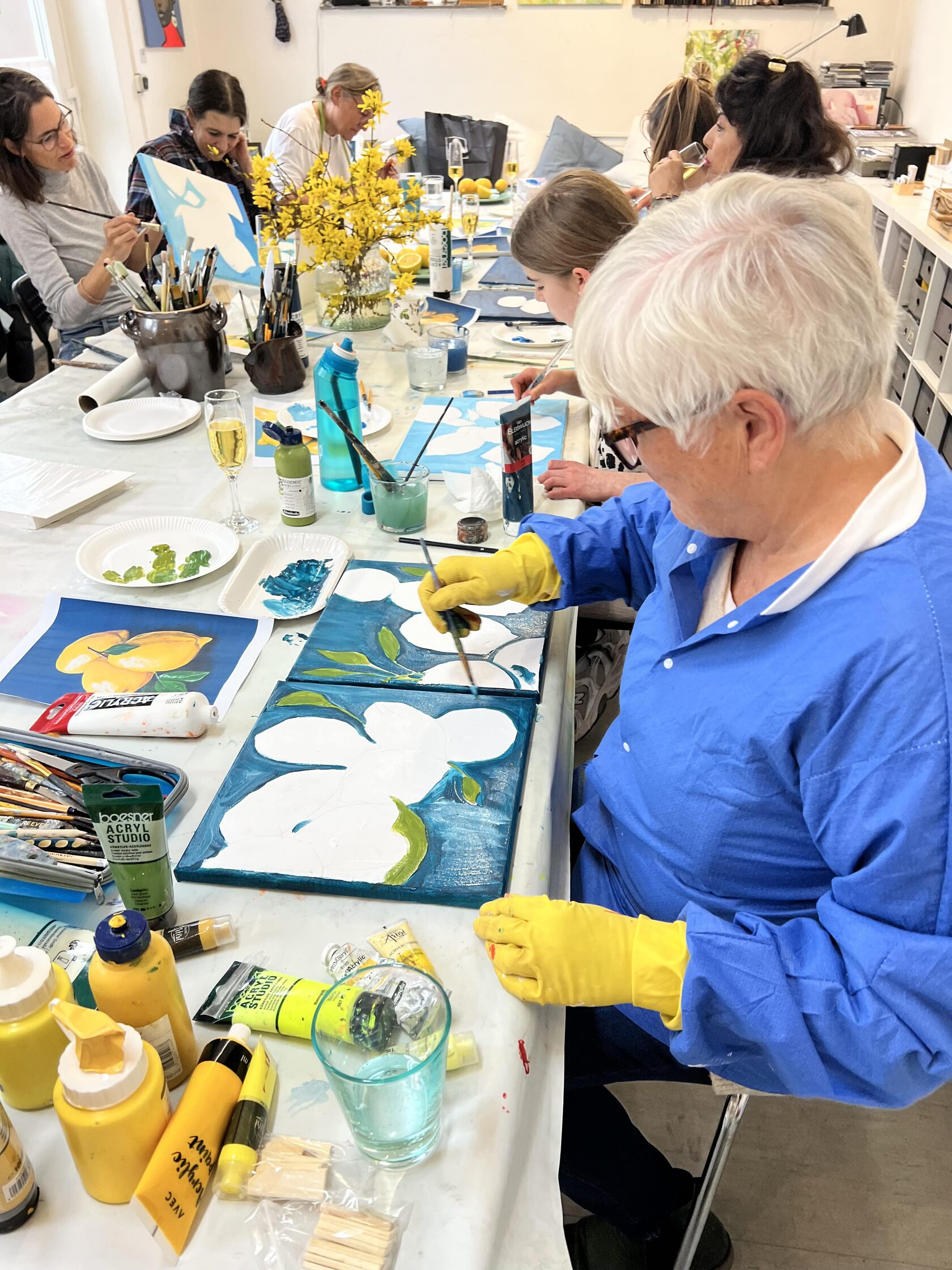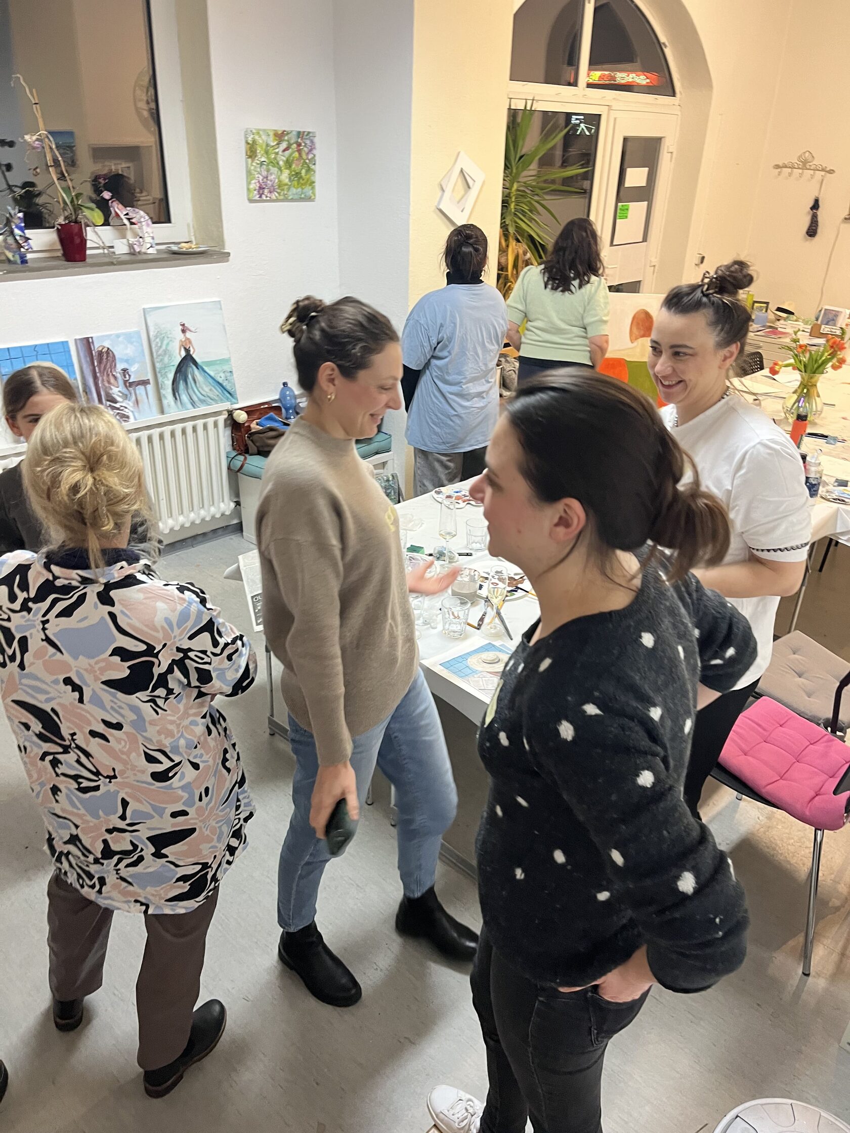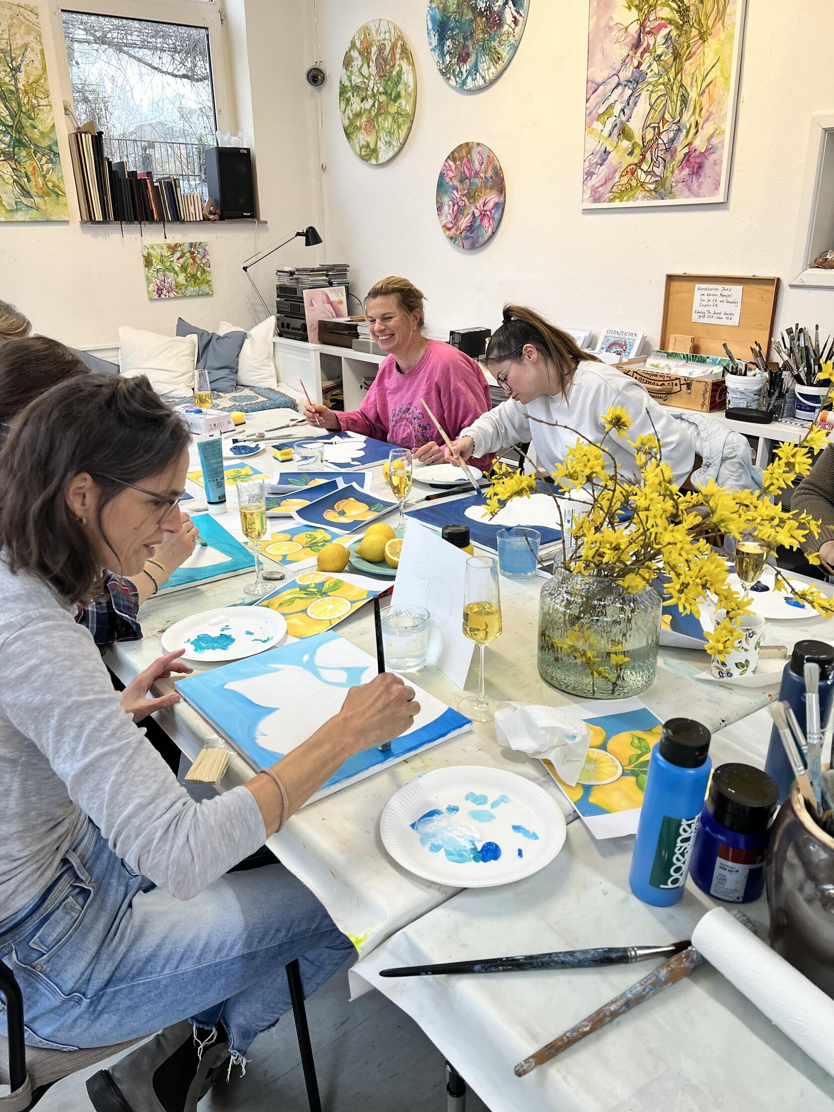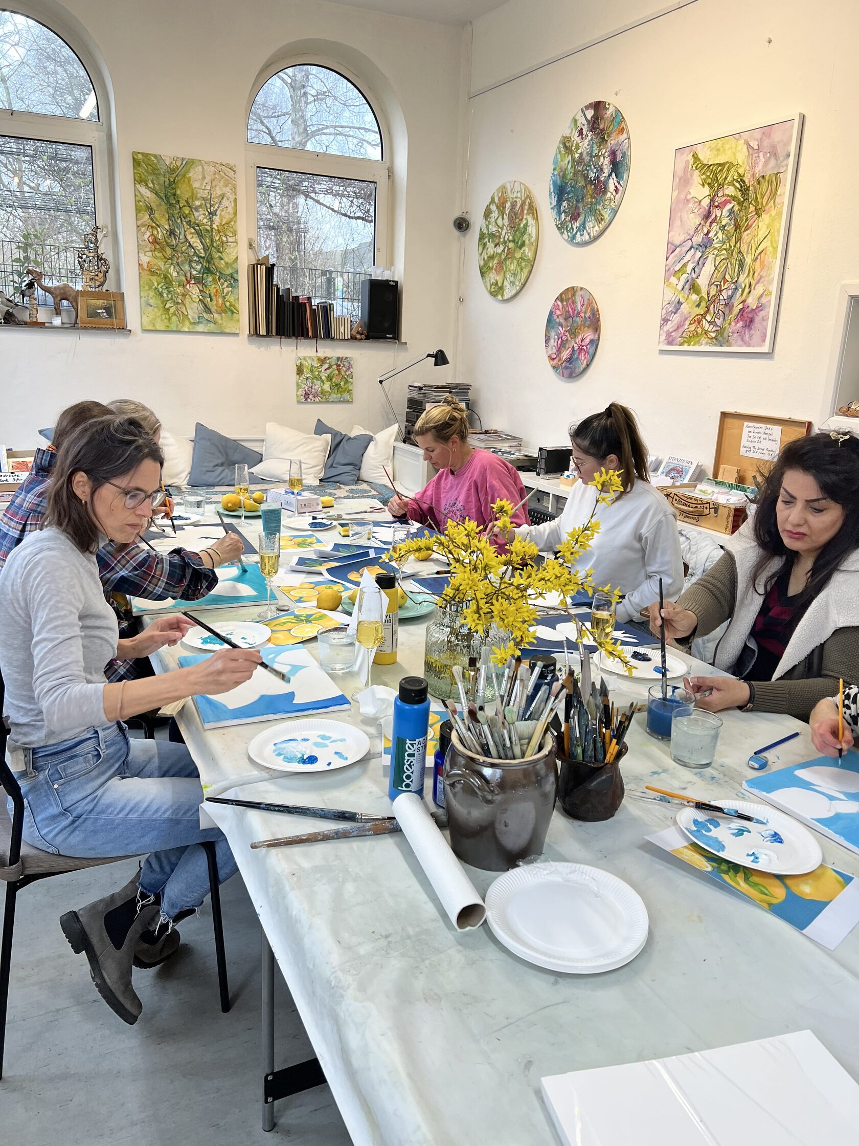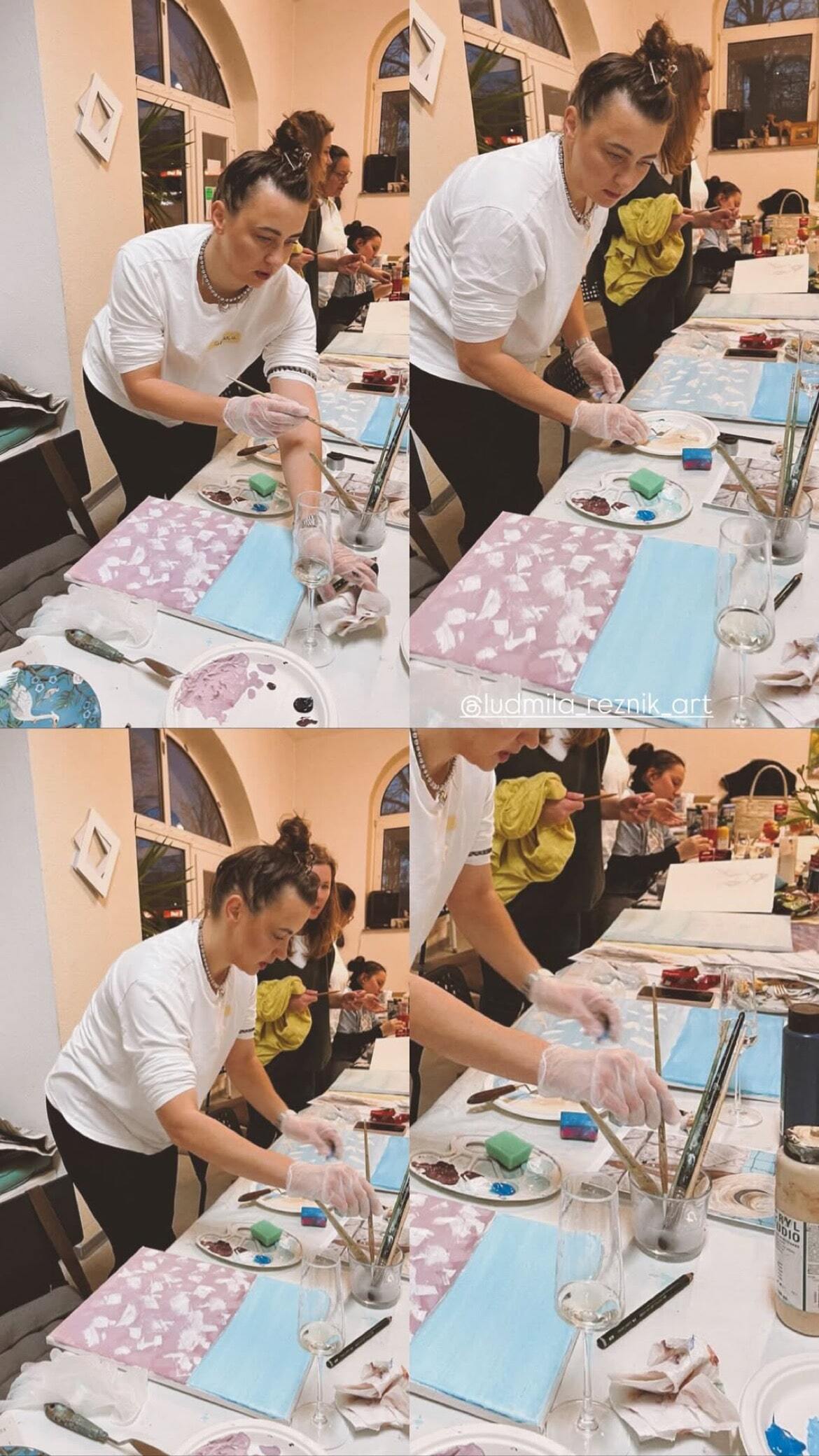 I have attended Ludmilla’s workshops several times with friends, and we always have a great time. The artworks we create are real masterpieces that we proudly hang at home. The atmosphere is creative, relaxed, and fun, and you meet nice, interesting people. Plus, there are delicious snacks and a glass of prosecco – perfect for escaping everyday life.