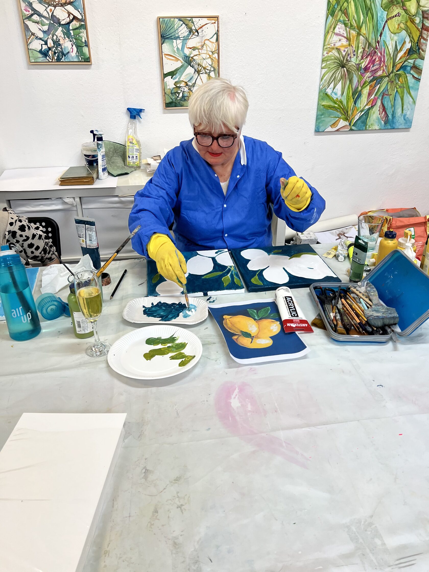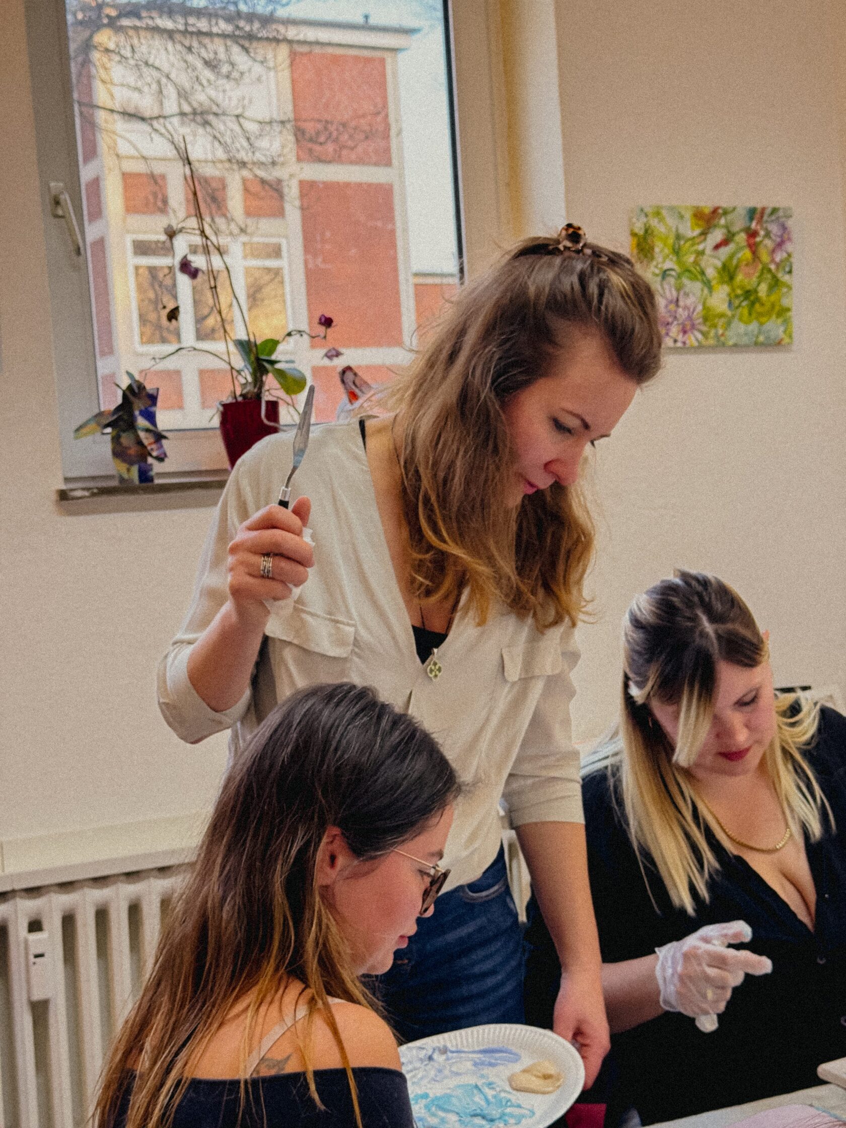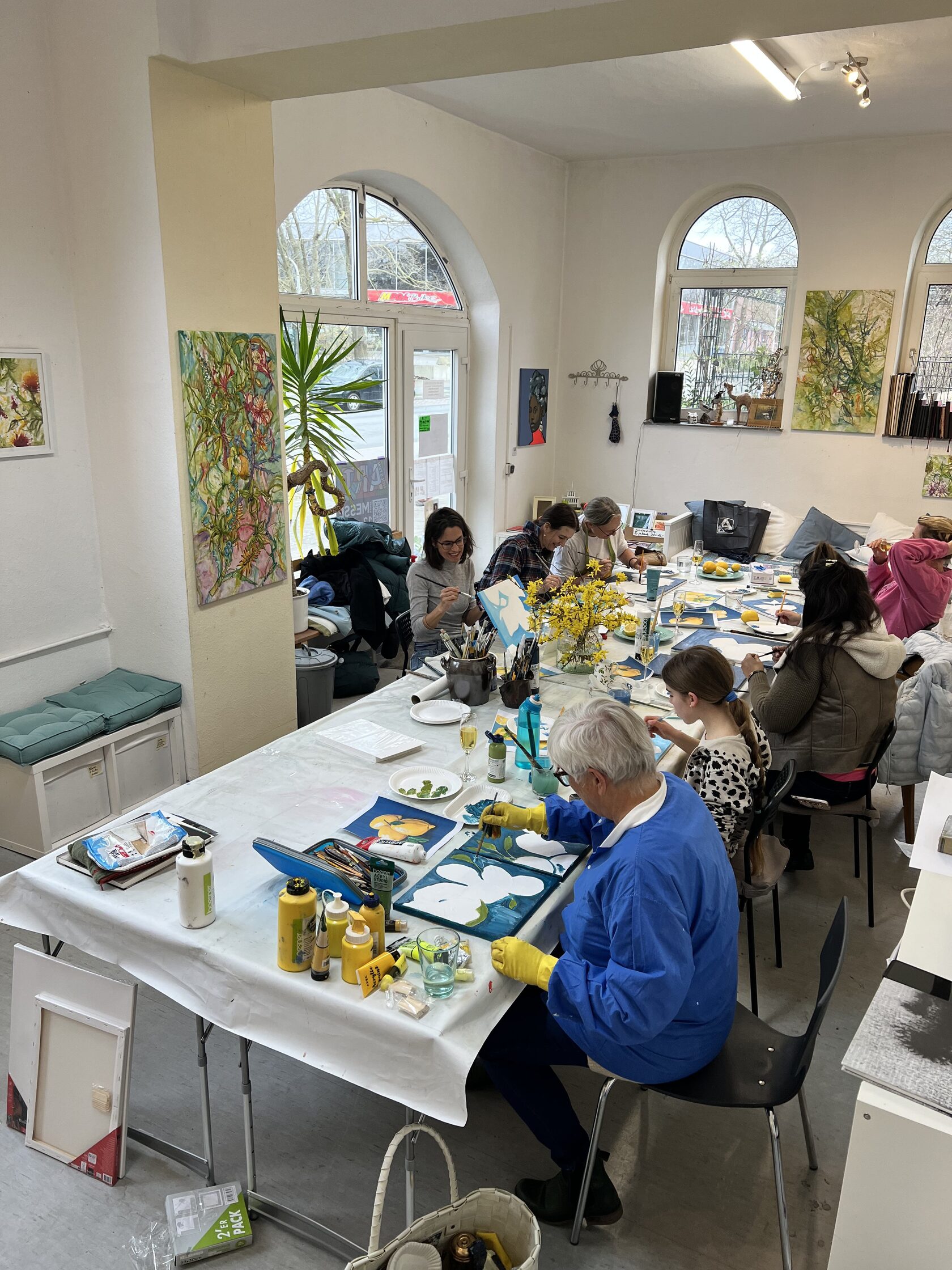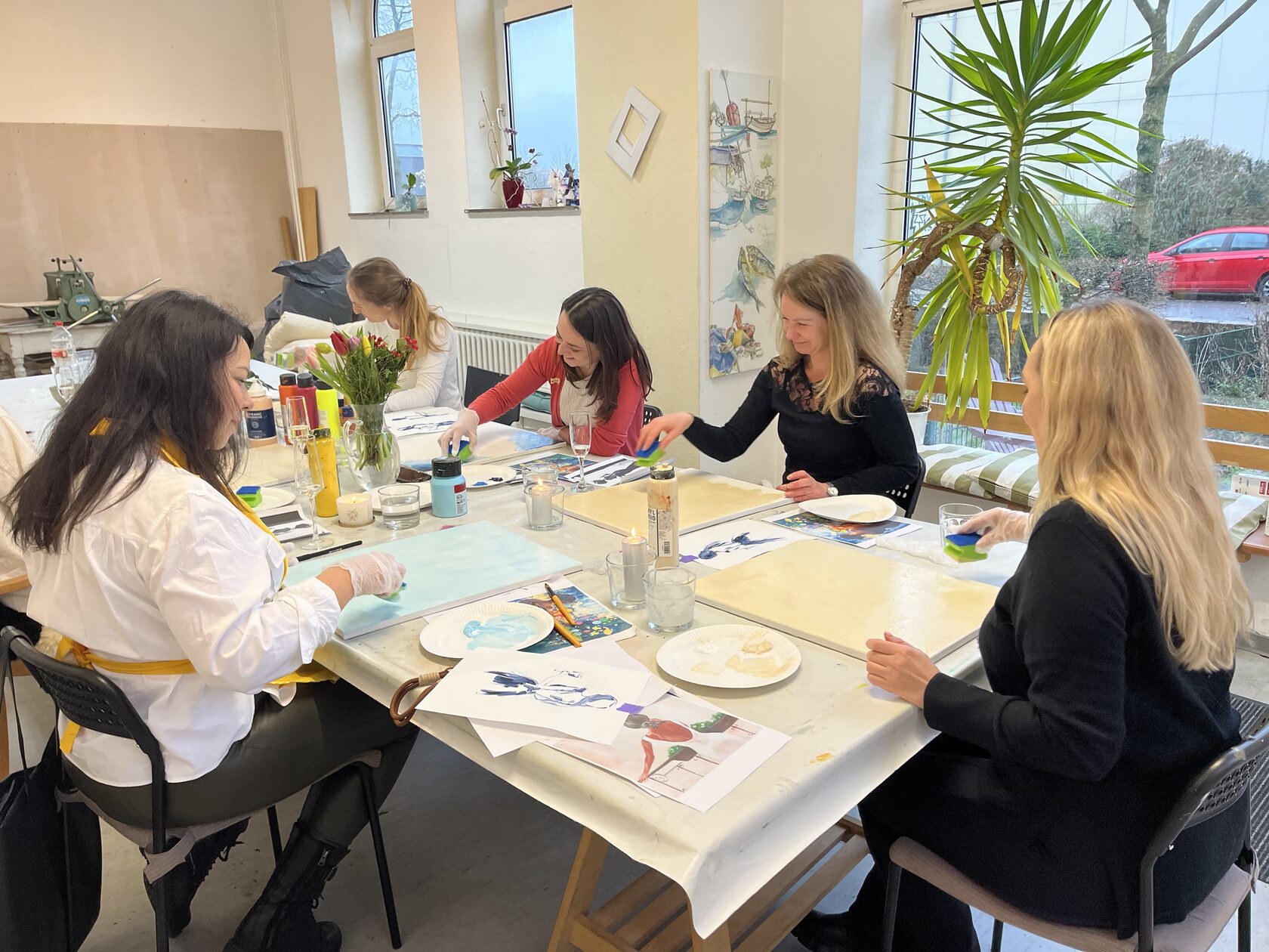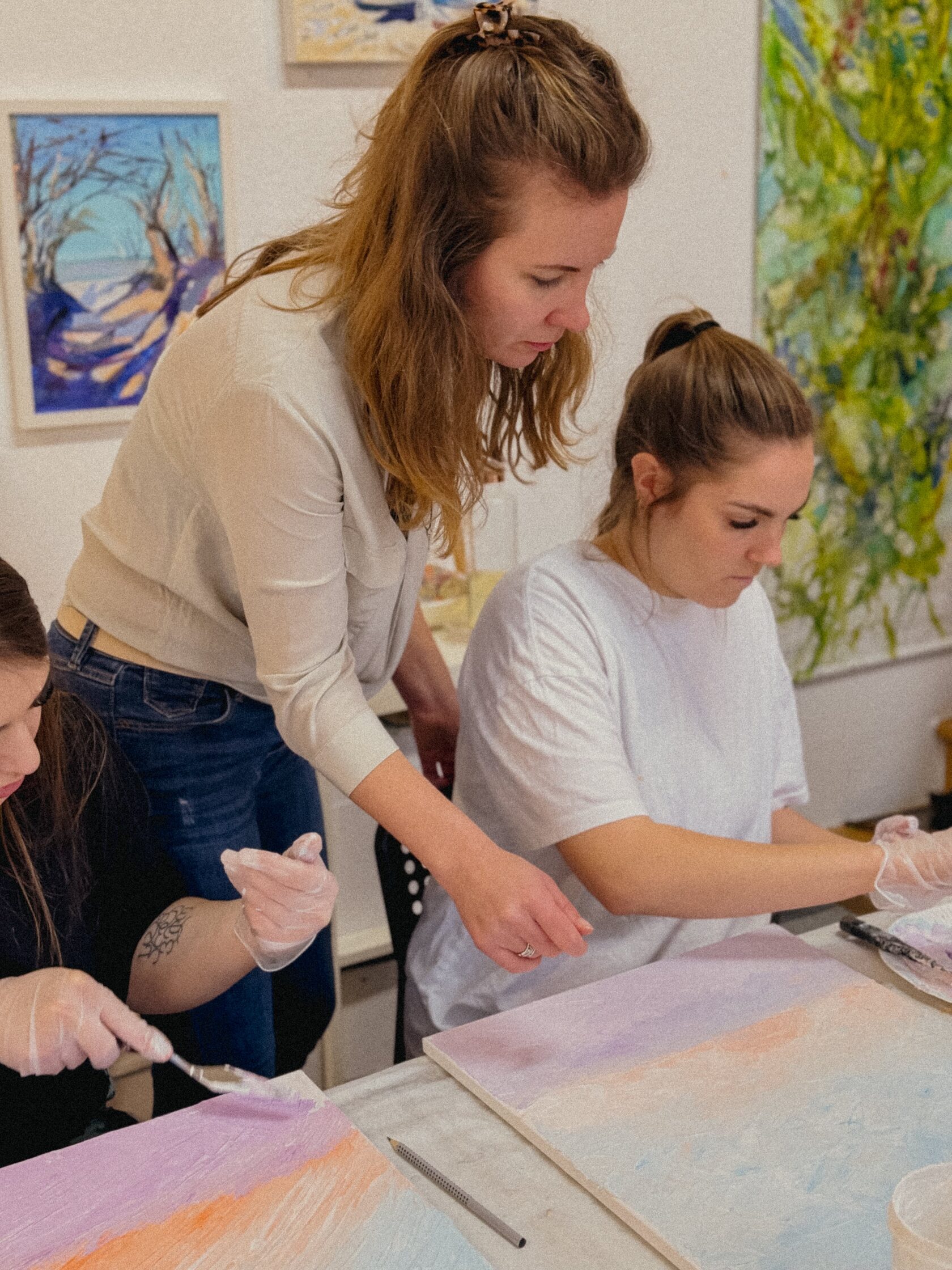 I have attended Ludmilla’s workshops several times with friends, and we always have a great time. The artworks we create are real masterpieces that we proudly hang at home. The atmosphere is creative, relaxed, and fun, and you meet nice, interesting people. Plus, there are delicious snacks and a glass of prosecco – perfect for escaping everyday life.