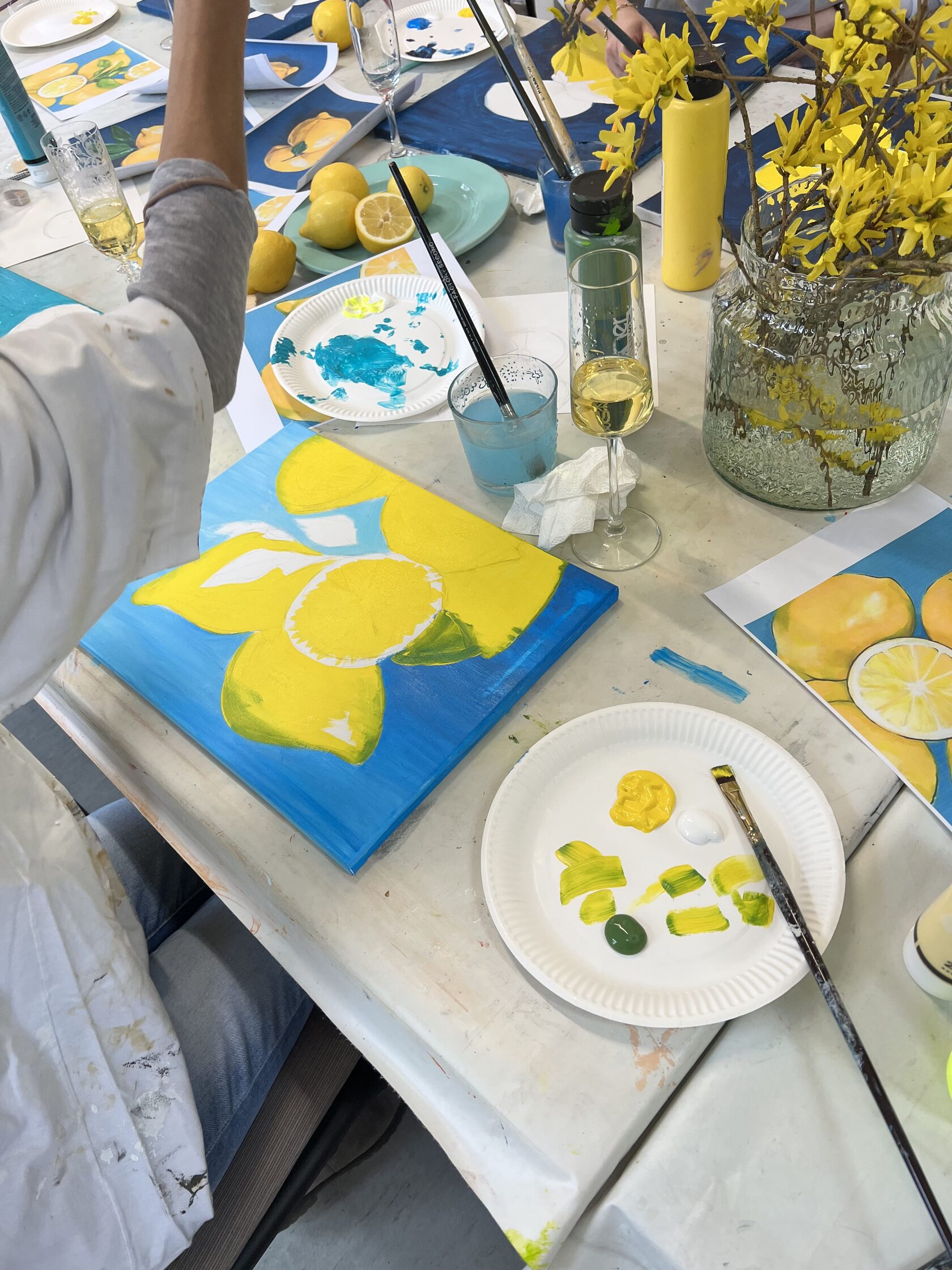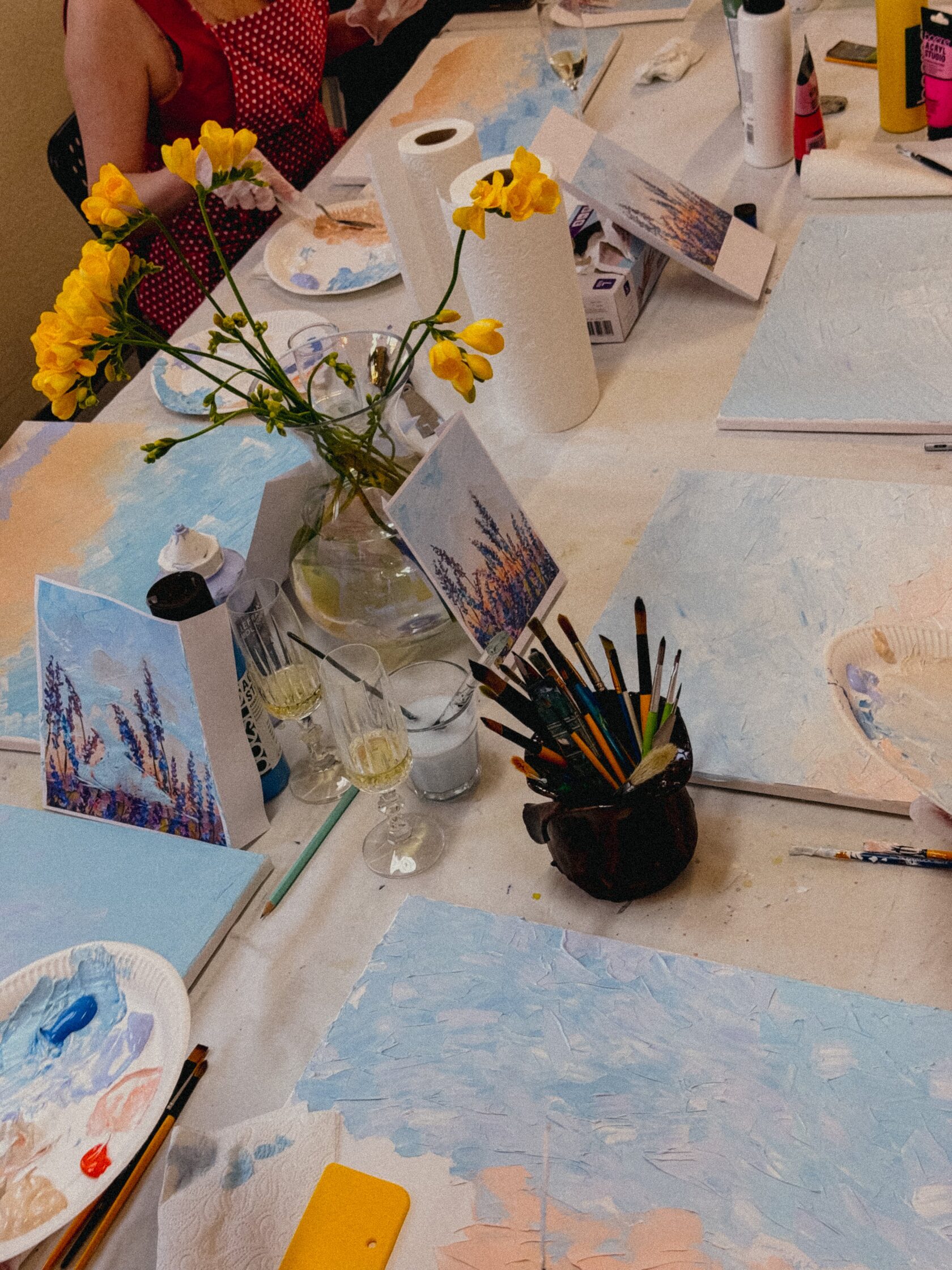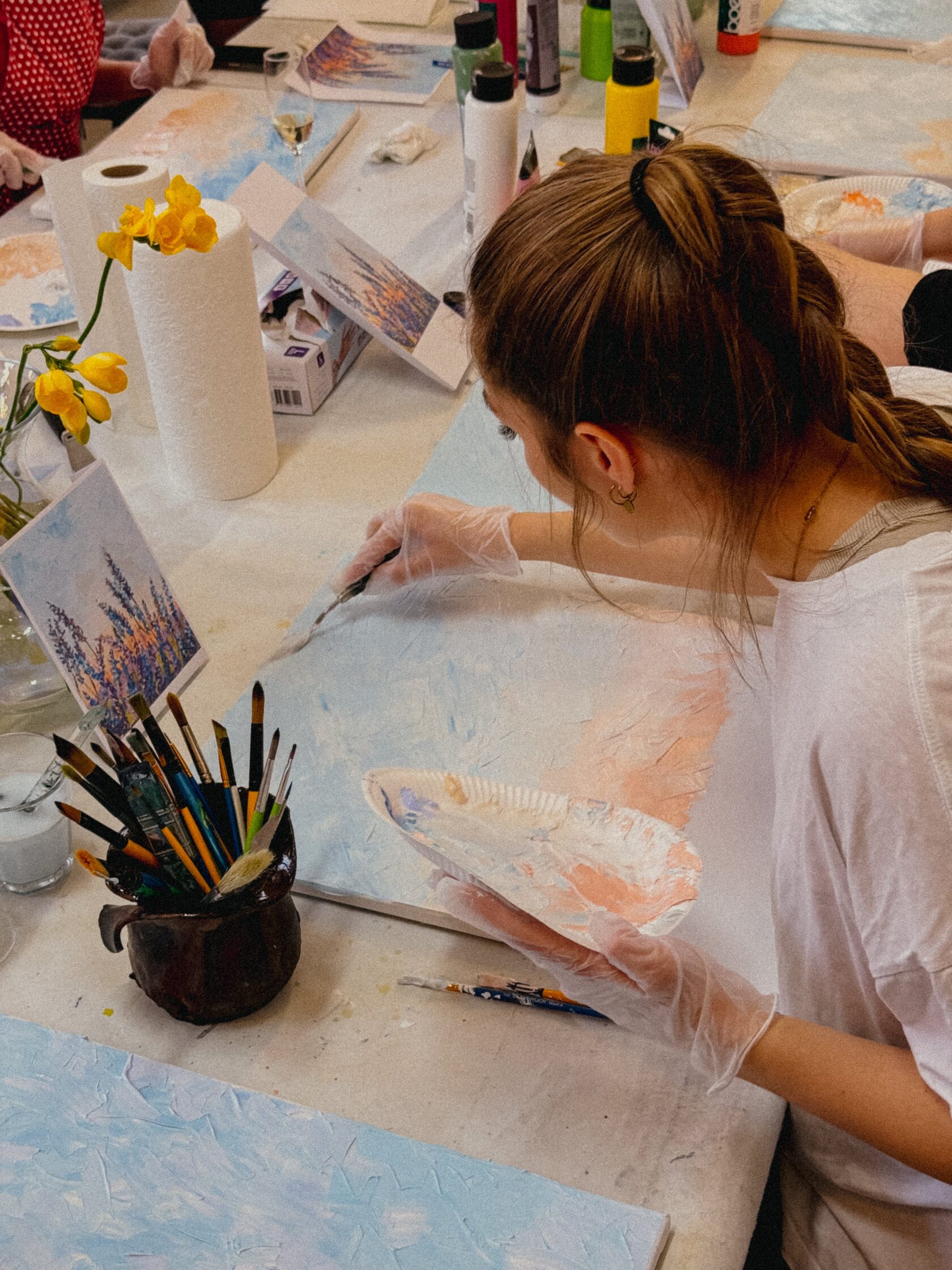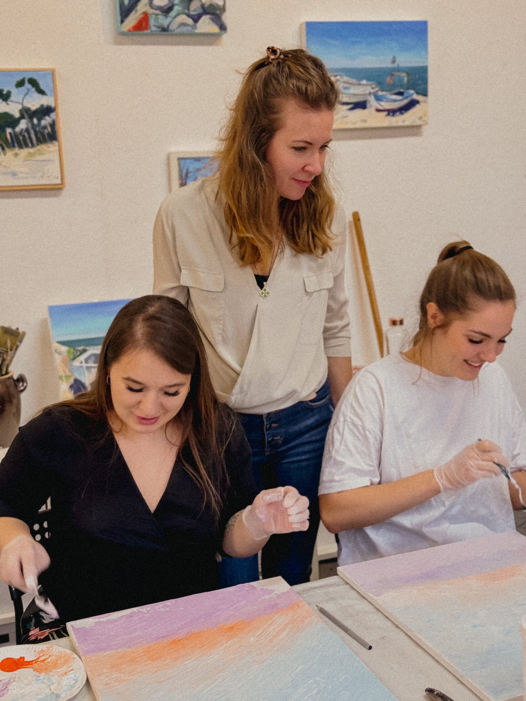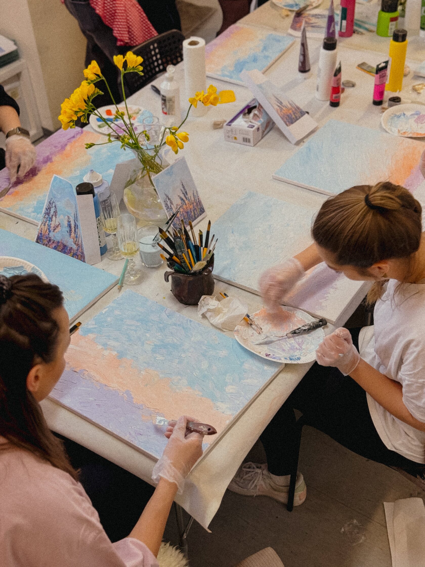 I have attended Ludmilla’s workshops several times with friends, and we always have a great time. The artworks we create are real masterpieces that we proudly hang at home. The atmosphere is creative, relaxed, and fun, and you meet nice, interesting people. Plus, there are delicious snacks and a glass of prosecco – perfect for escaping everyday life.